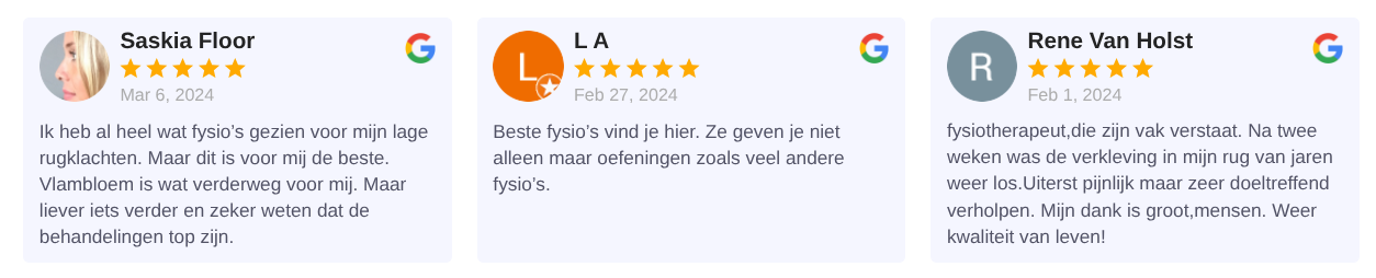 Direct resultaat: Bij Fysiotherapie Vlambloem helpen wij u snel en blijvend van uw klachten af. Onze gespecialiseerde therapeuten in Rotterdam Ommoord werken met moderne technieken en persoonlijke begeleiding. Zo kunt u snel weer pijnvrij bewegen.